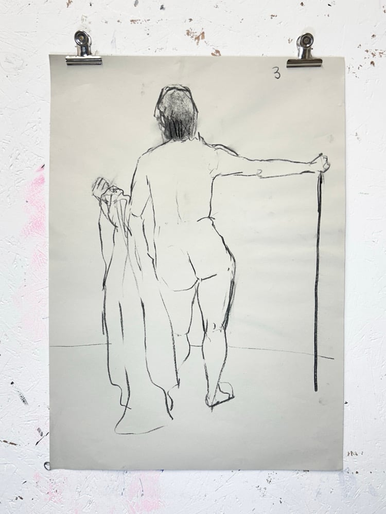 A nice big charcoal drawing with a great bum. Are they deciding which way to go? Surveying their work? Wading through a lagoon? Naked Gandalf? You decide.